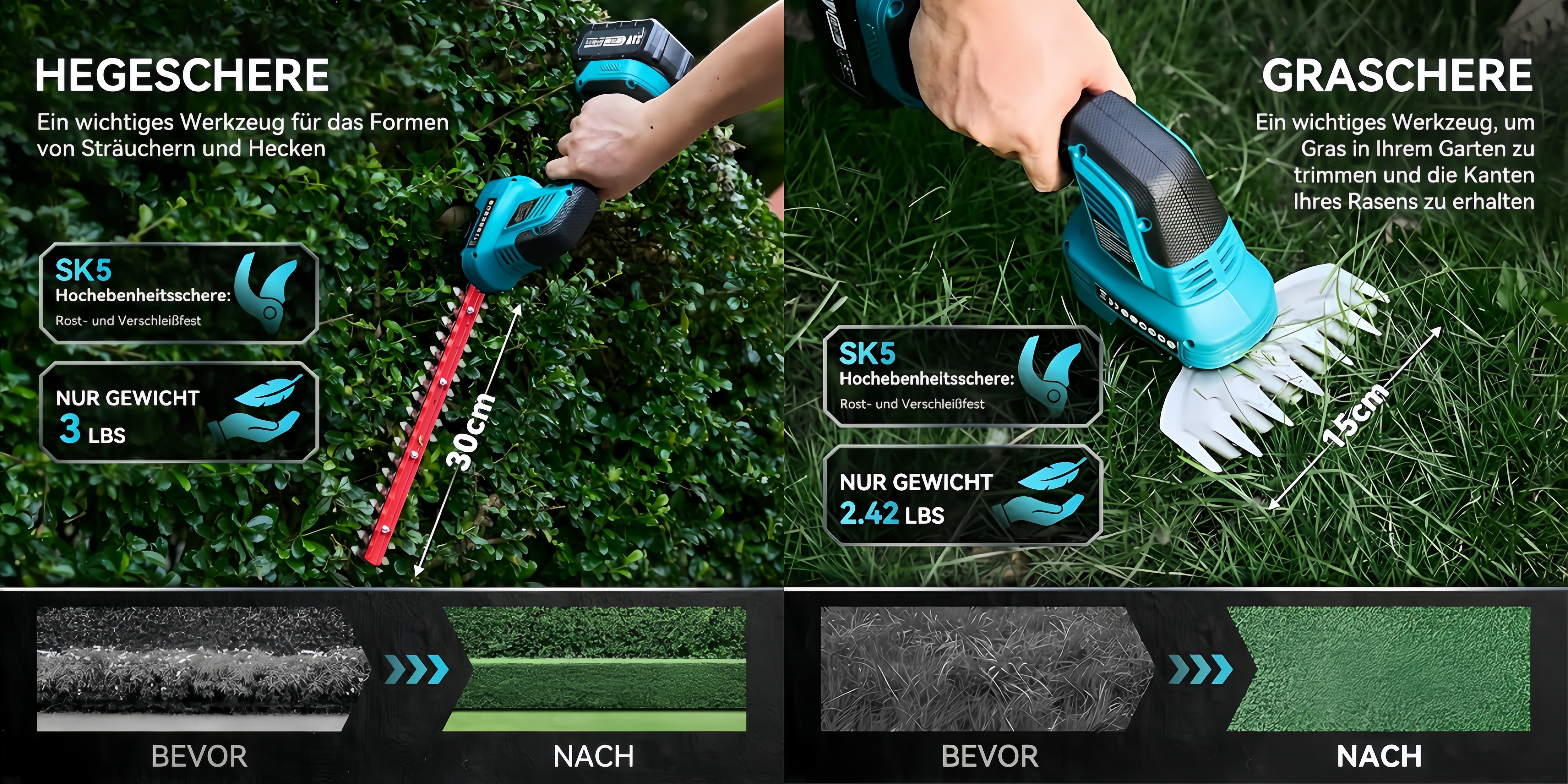 Egal, ob Sie Sträucher formen, Hecken schneiden oder Rasenkanten nacharbeiten möchten – Sie erzielen stets ein sauberes und professionelles Ergebnis.