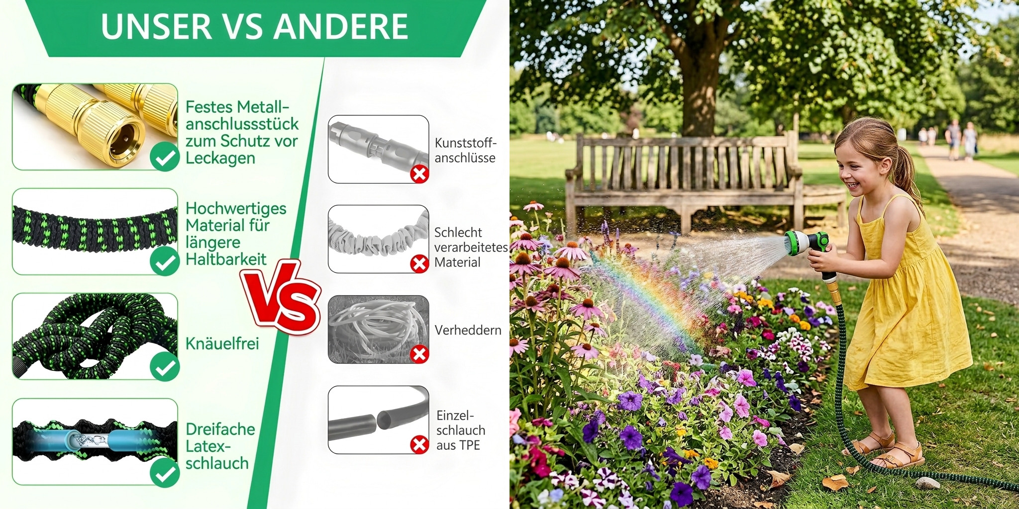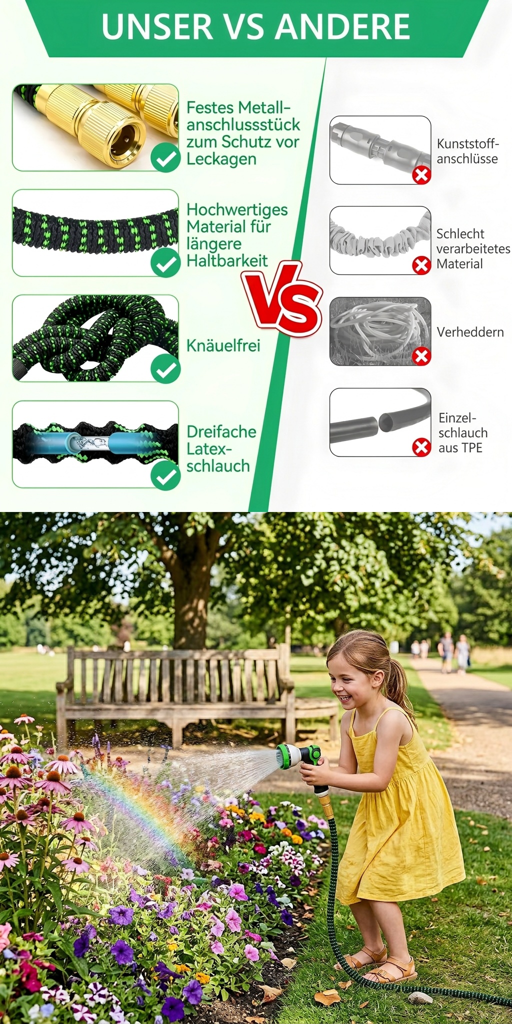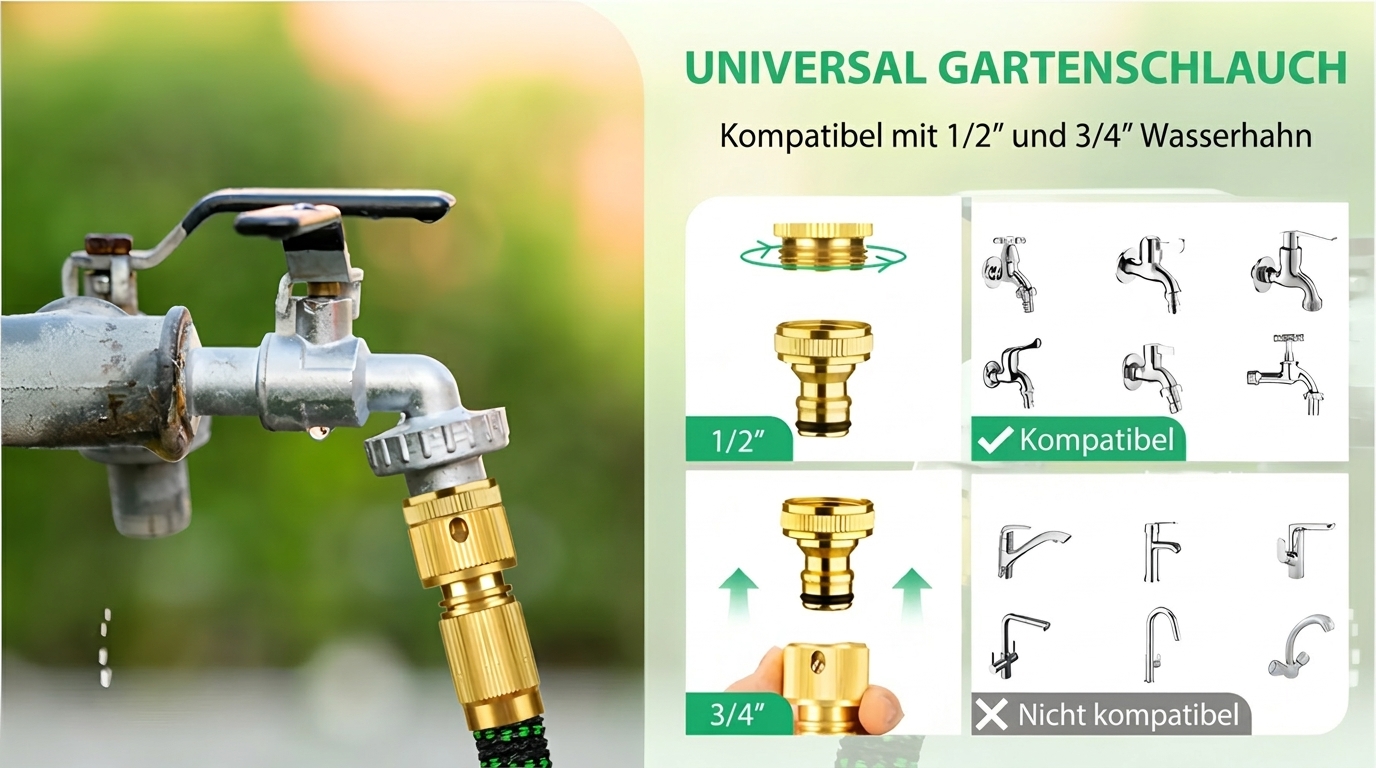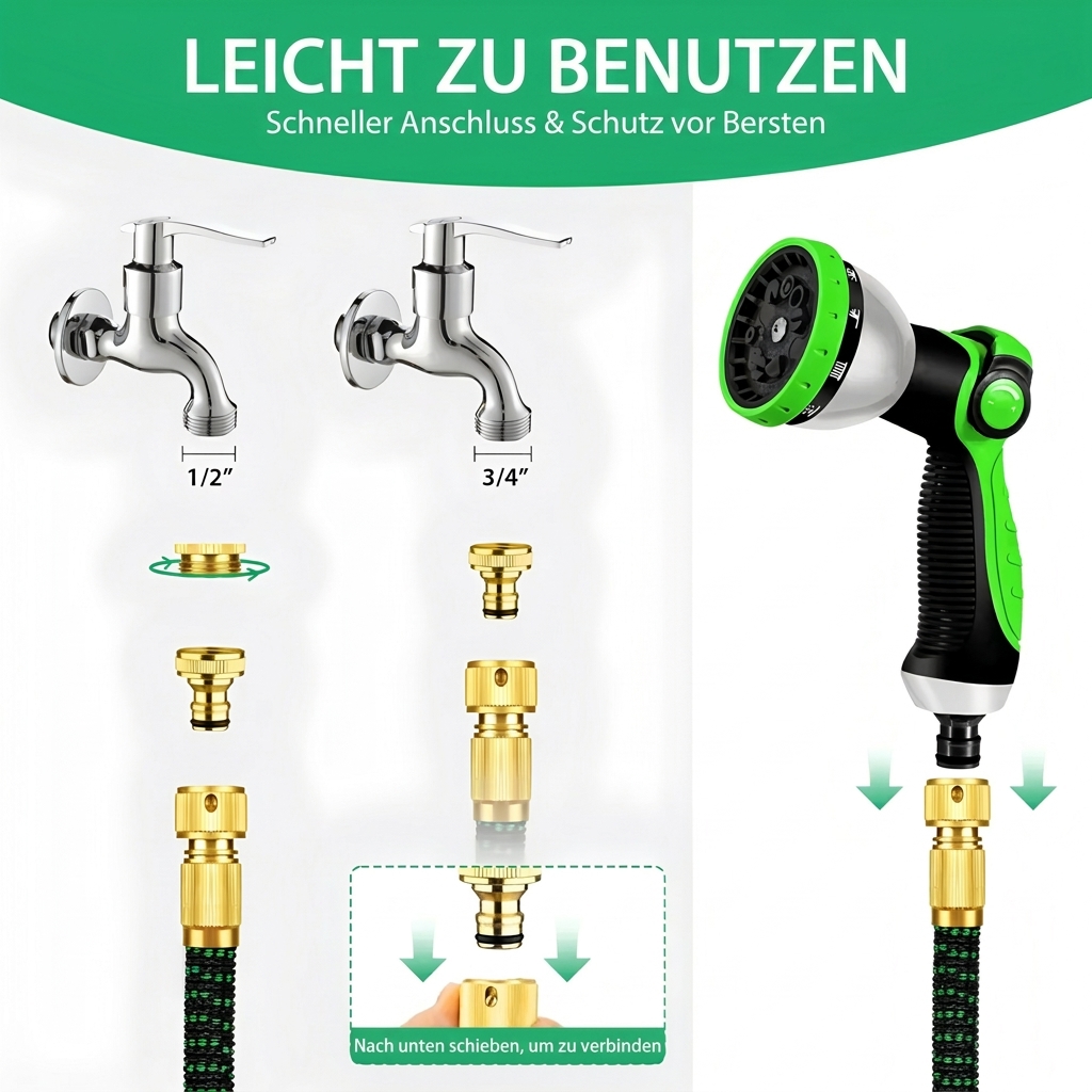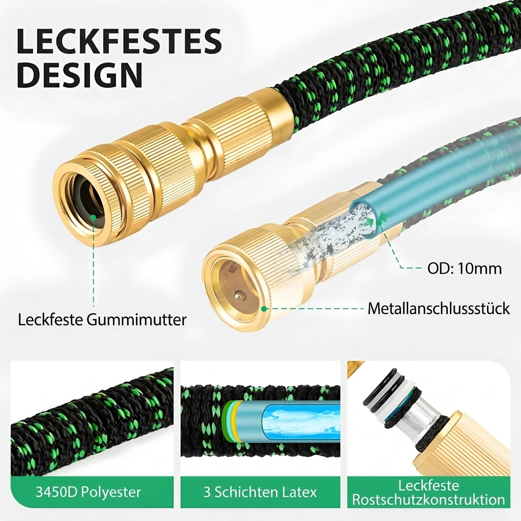 Der ausziehbare Gartenschlauch ist mit robusten 3/4"- und 1/2"-Metallanschlüssen ausgestattet, die rostbeständig und auslaufsicher sind und so eine zuverlässige Verbindung zu allen Standardwasserhähnen gewährleisten. Dieser hochwertige Gartenschlauch ist für eine langfristige Nutzung konzipiert – ohne Risse oder Undichtigkeiten.