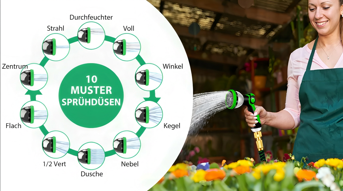 Unser 30 m (100 ft) langer, zusammenklappbarer Wasserschlauch ist mit einer verbesserten Sprühdüse mit 10 Sprühmustern ausgestattet und bietet damit mehr Auswahlmöglichkeiten als herkömmliche Modelle. Durch einfaches Drehen können Sie den gewünschten Sprühmodus einstellen – ideal zum Gießen von Pflanzen, Reinigen, Abwaschen von Haustieren oder für die Autopflege.