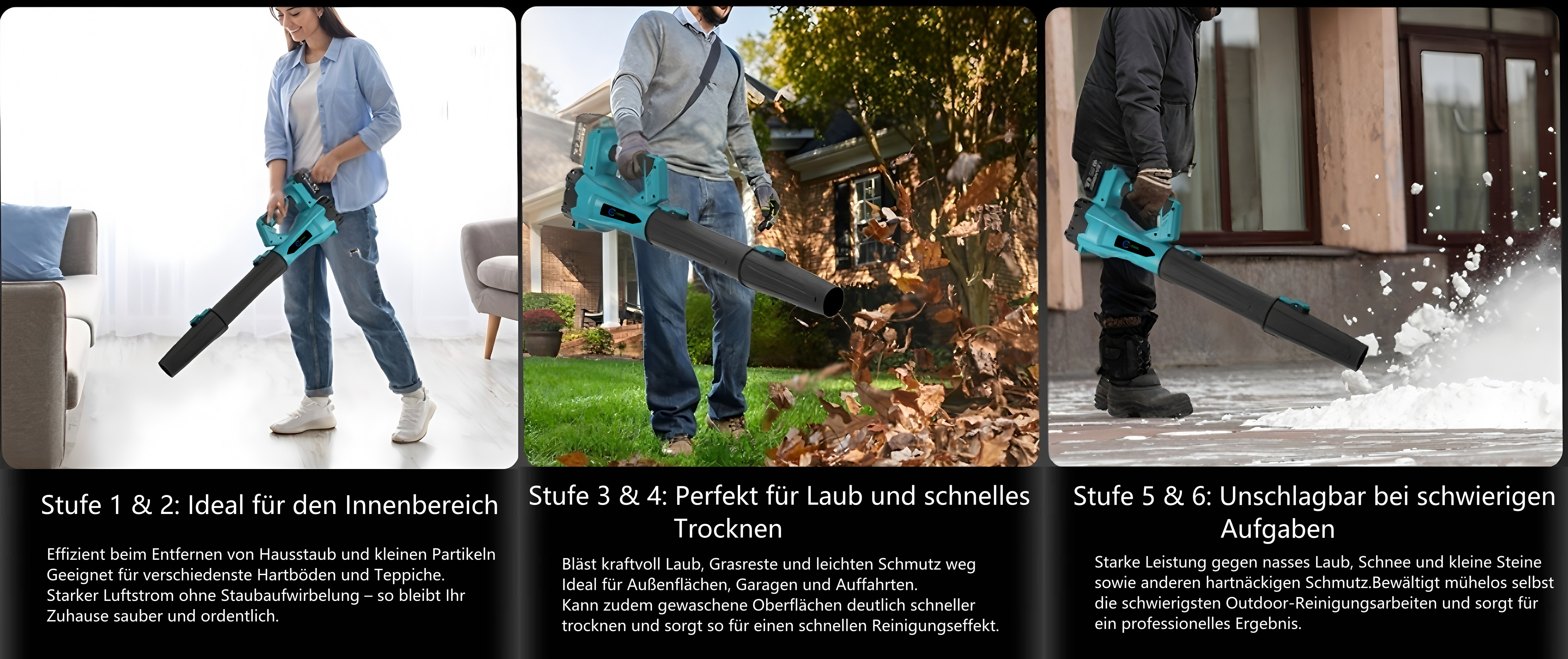Stufe 5–6: Starke Leistung für nasses Laub und Schnee – meistert Außenreinigungen mühelosEine Maschine, die alle Reinigungsaufgaben – drinnen wie draußen – meistert!